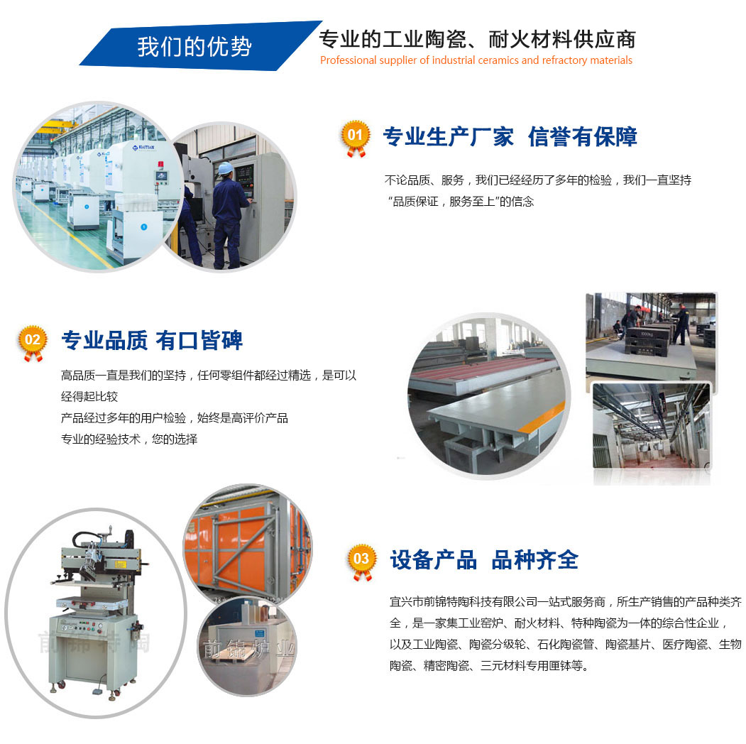 宜興市前錦特陶有限公司作為成員企業(yè)之一,公司主要生產(chǎn)工業(yè)陶瓷、窯具、匣缽、窯爐內(nèi)襯系列。工業(yè)陶瓷以生產(chǎn)氧化鋯陶瓷、氧化鋁陶瓷、碳化硅陶瓷、氮化硅陶瓷等先進(jìn)陶瓷為主;碳化硅制品有碳化硅異形件、三明治板、爐管等系列;耐火高溫窯具為剛玉爐管、剛玉莫來(lái)石制品、剛玉推板等產(chǎn)品;以及燒結(jié)墊板、氧化鋁空心球制品、sic板、石墨坩堝、堇青石復(fù)合莫來(lái)石板移進(jìn)板、鋯粉、氮化硅陶瓷環(huán)、陶瓷棒、石化陶瓷管、陶瓷基片、磨介、分級(jí)輪和氮化硅球閥、熱電偶保護(hù)管、升液管等... ![]() |