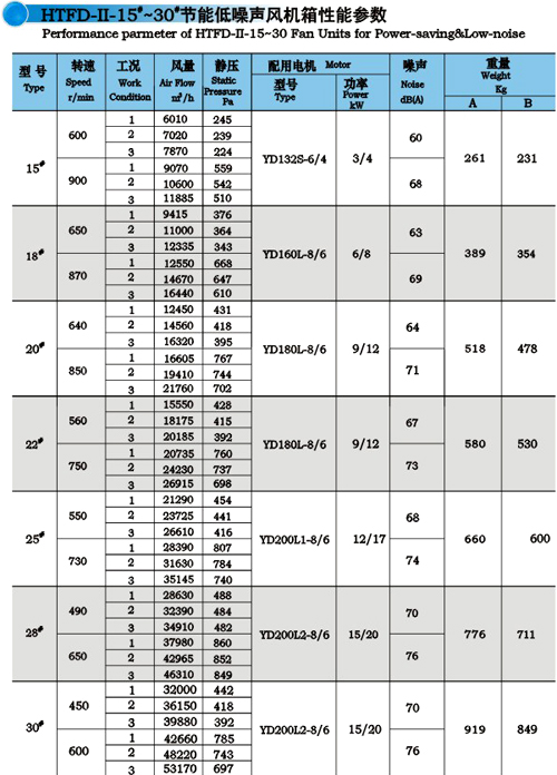 | HTFD系列節(jié)能低噪聲風(fēng)機(jī)箱系引進(jìn)德國、日本先進(jìn)技術(shù)而研制成的一機(jī)兩用(通風(fēng)和消防)箱體式離心風(fēng)機(jī),是在HTFC的基礎(chǔ)上進(jìn)行改進(jìn)優(yōu)化的新一代產(chǎn)品。它具有效率高、噪聲低、耐高溫、重量輕、安裝方便等優(yōu)點(diǎn),是目前高層建筑通風(fēng)暨消防排煙兩用的新型產(chǎn)品。 本系列風(fēng)機(jī)結(jié)構(gòu)形式分A型、B型、HG型三種,即電機(jī)安裝在箱體內(nèi)的為A型(A型為通風(fēng)型);電機(jī)安裝在箱體外的為B型(B型為消防型);外轉(zhuǎn)子電機(jī)的風(fēng)機(jī)箱為HG型。其中A型和B型的同一機(jī)號(hào)按不同的性能參數(shù)又分為Ⅰ型和Ⅱ型。此類風(fēng)機(jī)可應(yīng)用于賓館、飯店、禮堂、地下室、廠礦企業(yè)的車間、辦公室等多種需要消防并通風(fēng)換氣的場所,用戶可根據(jù)不同使用場合和不同用途作不同的選擇。 |